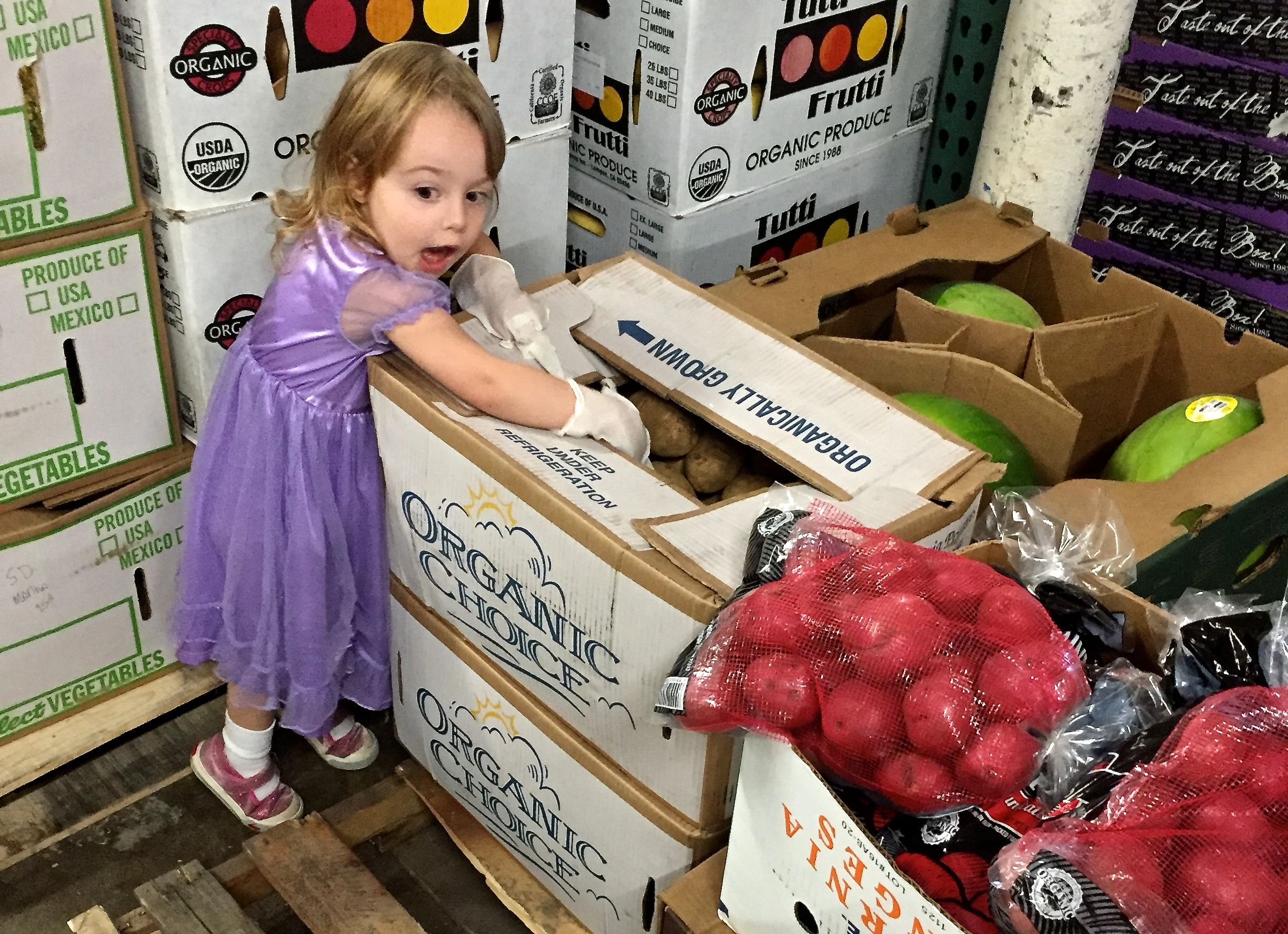 Next the girls and I rolled over to our favorite place to shop, Specialty Produce. The last time we were there, Littlest Bird thought it was hilarious to run away from me. Keeping kids close is a big rule there as it is a busy industrial warehouse, with forklifts, carts, and lots of people. She even ran past an “employee only” sign into the truck loading area. So this time I asked her if she would like to “go uppies.” We haven’t worn Miss Independent in any wraps or the Ergo in ages, but she thought it was a blast to go for a ride. Problem solved!