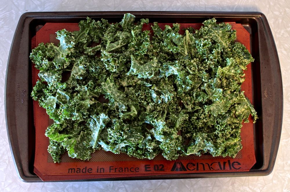 3. Preheat oven to 200° F. Meanwhile, in a large bowl, massage the “sauce” into the kale. Then spread it onto a baking sheet lined with parchment paper or a silicone mat. Bake for 45 minutes or so, checking and gently stirring the kale occasionally, until it is dried but not overly toasted.