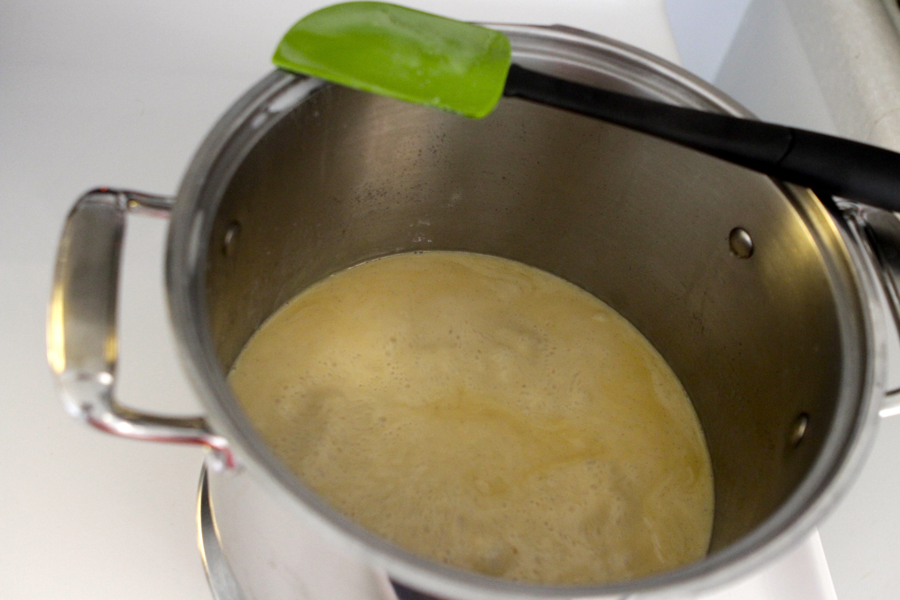 - Add sugar to milk, bring up to a simmer.