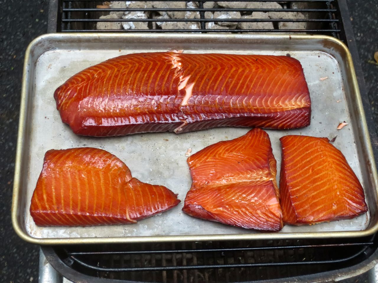 He shared, “Twenty minutes soaking in rum, four hours curing in salt & brown sugar, thirty minutes cooking in apple wood smoke, three weeks eating.” Bobby added his latest tweak for perfecting home smoked salmon: “I buy these large three-pound fillets which have fat parts and skinny parts. I separate them with a knife (that’s why there are four pieces) and the skinny parts smoke for twenty minutes and the fat part for thirty.” Papa Bird prefers the skinny parts. Although a large piece of salmon was pretty in this post, the skinny fillets get more of the rub and smoke flavor. But, could be personal preference…