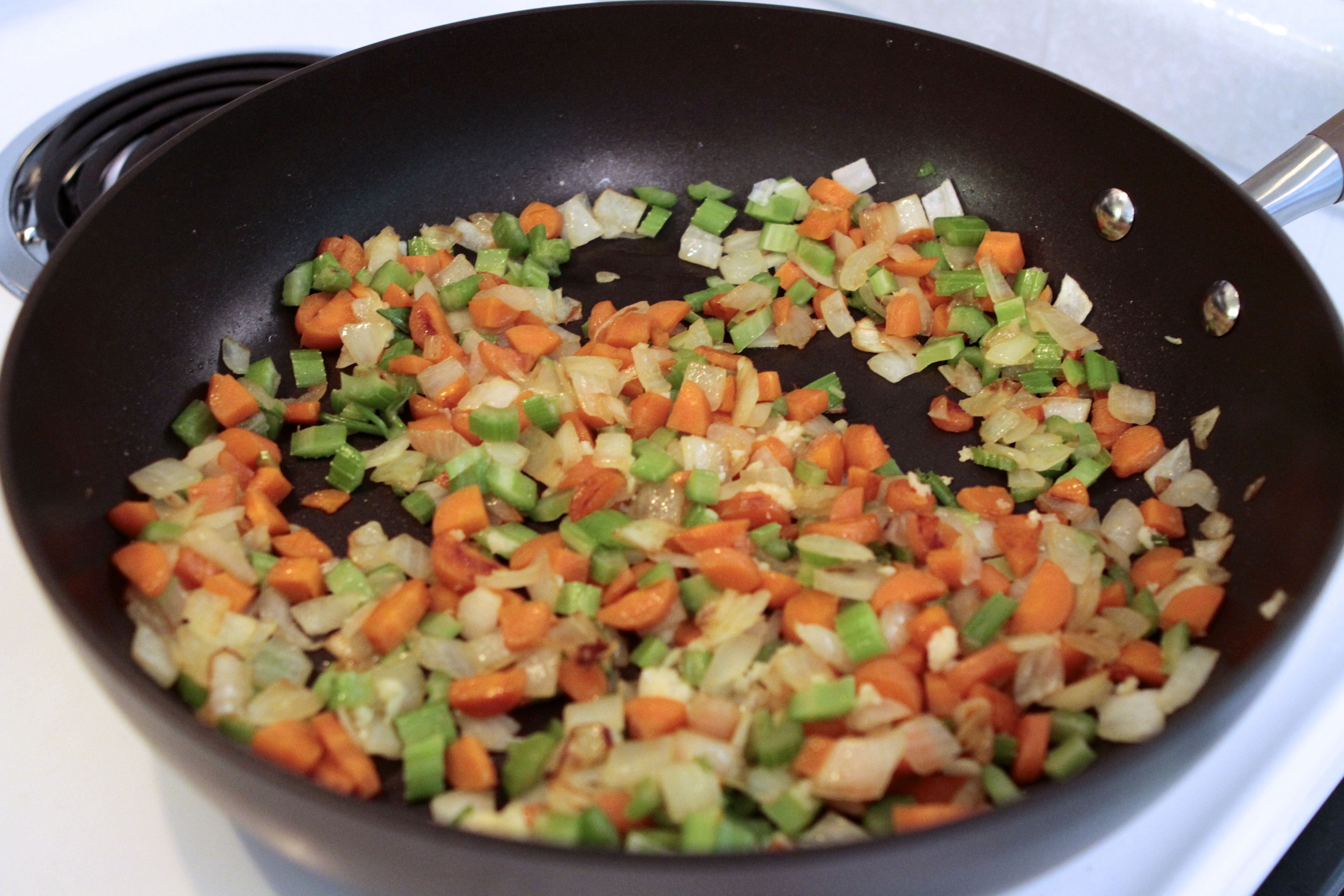 Heat the oil in a medium skillet. Sauté the diced onion, carrot, bell pepper, and add remaining cumin, spices, and salt/pepper. Let cool slightly.
