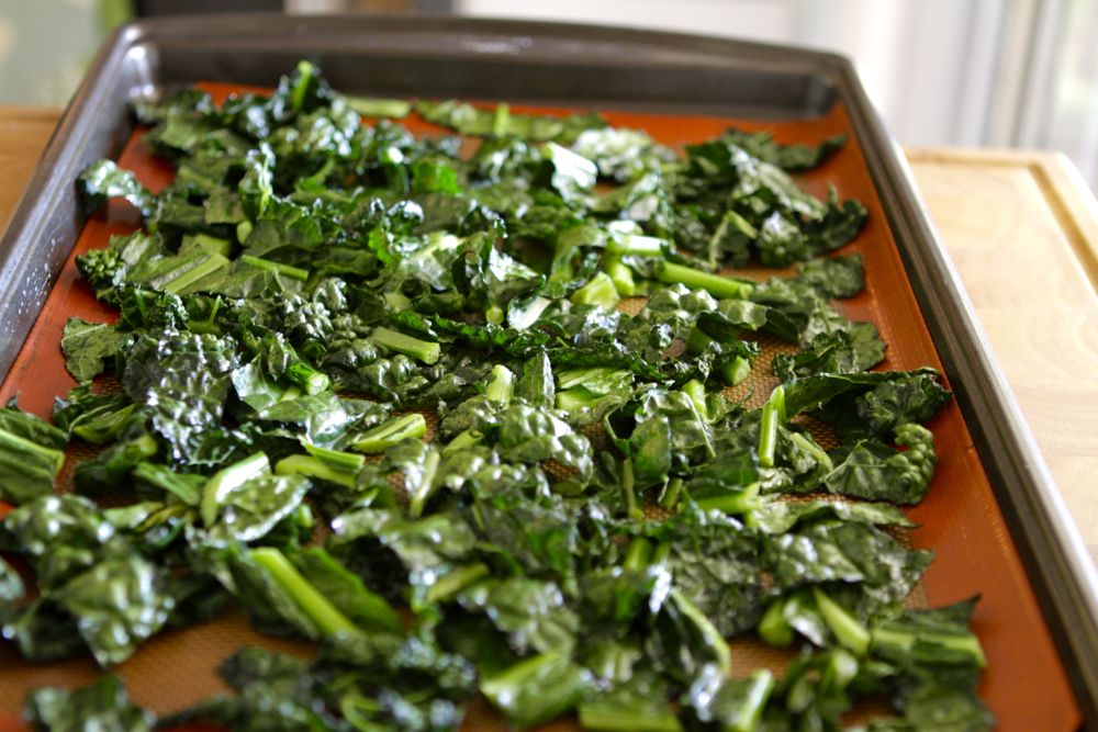 3. Preheat oven to 200° F. Meanwhile, in a large bowl, massage the “sauce” into the kale. Then spread it onto a baking sheet lined with parchment paper or a silicone mat. Bake for 45 minutes or so, checking and gently stirring the kale occasionally, until it is dried but not overly toasted.
